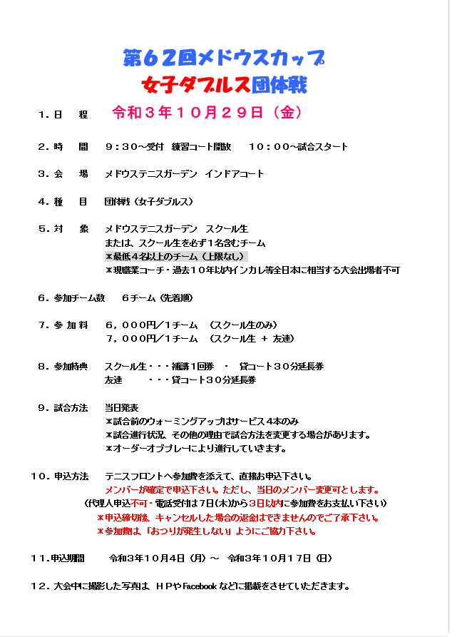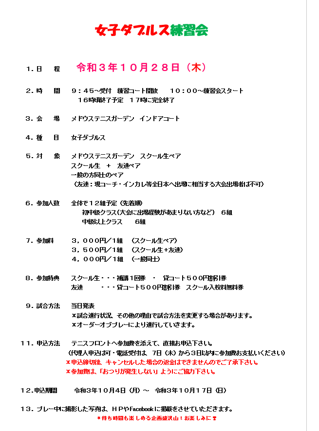 また女子ダブルスの練習会と団体戦の申し込みはまだ空きが