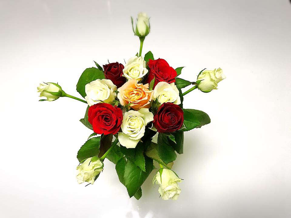 オレンジをセンターに置き紅白で囲み、白薔薇を散りばめる