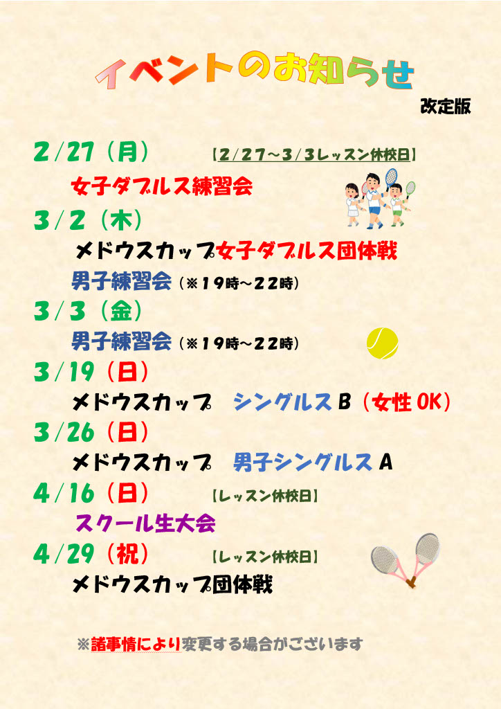 レッスン、貸しコート営業につきましては、リニモが止まらない