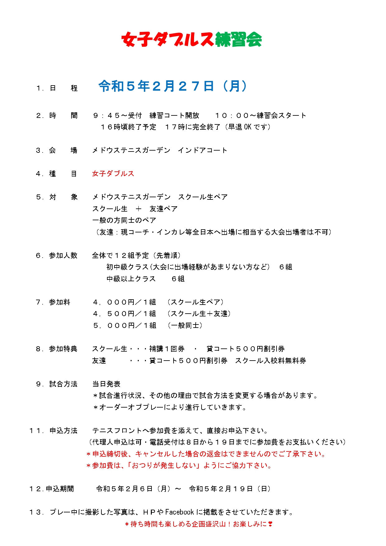 女子ダブルス練習会はあと3組募集します