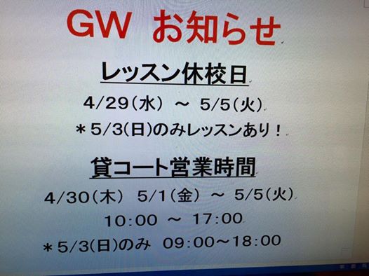 ゴールデンウィークの休校日情報と先日行われたスクール生大会の記事へのリンクを